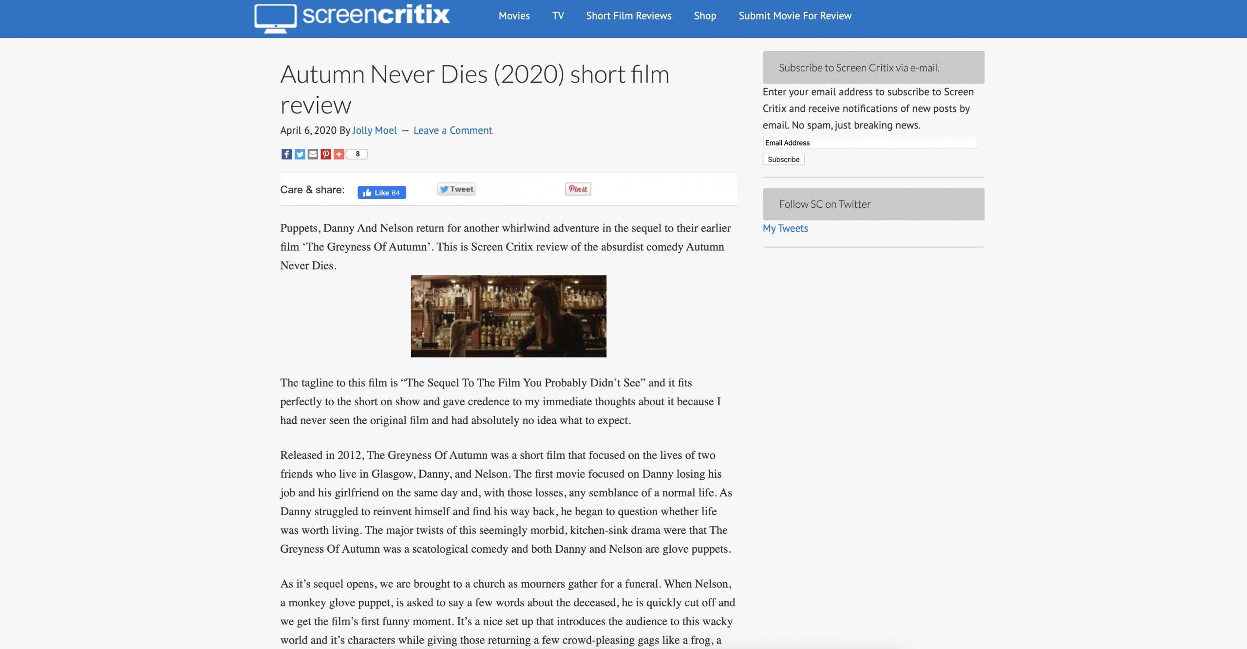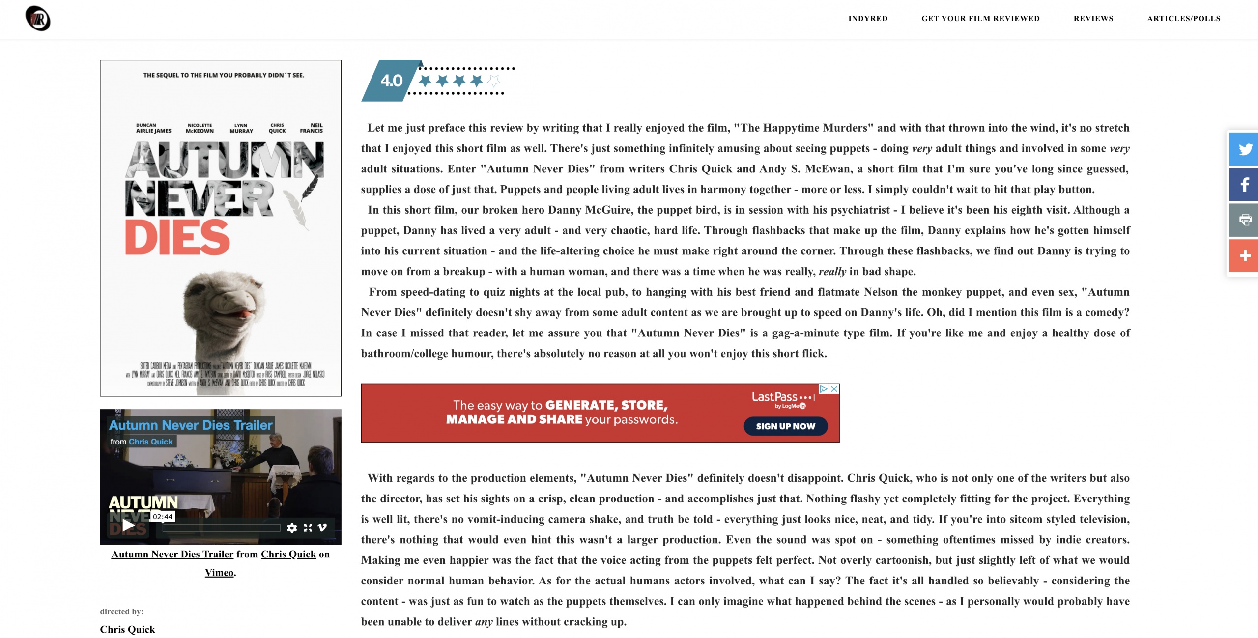 The fifth review is in for Autumn Never Dies and it comes from our friends over at FilmThreat in America. They scored the film 8.5/10 star review and it was really nice to read “Autumn Never Dies ably stands entirely on its own, as the characters are well sketched out, […]